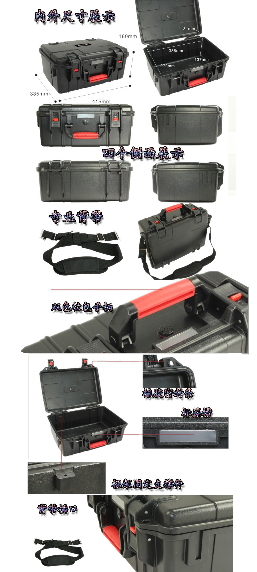 簡(jiǎn)要說(shuō)明:廣泛用于傳媒、公安、消防、軍隊(duì)、航空、戶外攝影、野外考察、科學(xué)探測(cè)等眾多領(lǐng)域的高端儀器、儀表。具有高強(qiáng)度、高抗壓沖擊、防潮、絕對(duì)密封、防塵、防水等特點(diǎn)。產(chǎn)品材質(zhì):ABS原料,箱體采用高抗沖擊的高分子聚合材料一體注塑成型,密封采用扁型彈性發(fā)泡密封橡膠條,確保防水氣密,所有較軸均采用不銹鋼材質(zhì)。