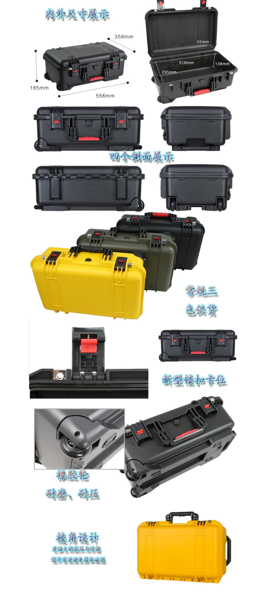 簡要說明:廣泛用于傳媒、公安、消防、軍隊、航空、戶外攝影、野外考察、科學(xué)探測等眾多領(lǐng)域的高端儀器、儀表。具有高強度、高抗壓沖擊、防潮、絕對密封、防塵、防水等特點。產(chǎn)品材質(zhì):ABS原料,箱體采用高抗沖擊的高分子聚合材料一體注塑成型,密封采用扁型彈性發(fā)泡密封橡膠條,確保防水氣密,所有較軸均采用不銹鋼材質(zhì)。