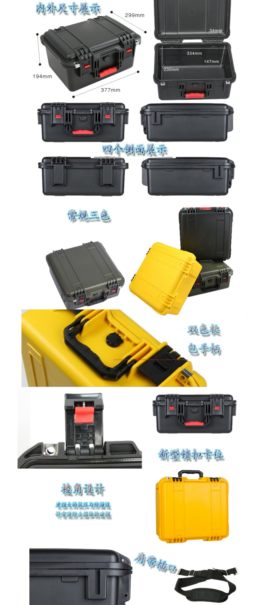 簡要說明:廣泛用于傳媒、公安、消防、軍隊、航空、戶外攝影、野外考察、科學(xué)探測等眾多領(lǐng)域的高端儀器、儀表。具有高強度、高抗壓沖擊、防潮、絕對密封、防塵、防水等特點。產(chǎn)品材質(zhì):ABS原料,箱體采用高抗沖擊的高分子聚合材料一體注塑成型,密封采用扁型彈性發(fā)泡密封橡膠條,確保防水氣密,所有較軸均采用不銹鋼材質(zhì)。